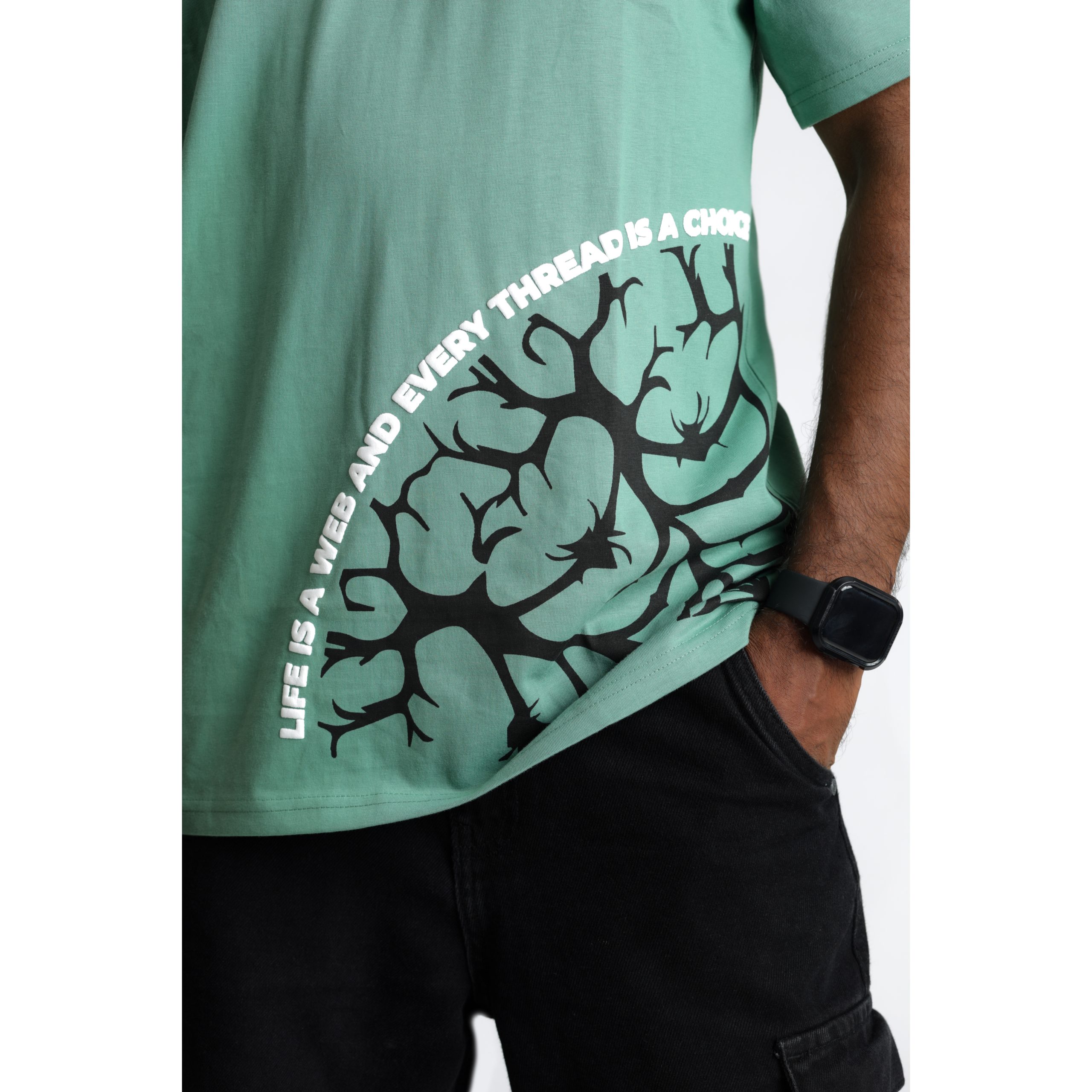 The “Web of Eternity” T-shirt is a seamless fusion of intricate mandala art and the mesmerizing geometry of a spider’s web, symbolizing balance, patience, and creativity. Designed on a soothing pista green fabric, this unique piece blends spiritual symbolism with nature’s artistry, creating a look that is both bold and meaningful. Made from ultra-soft, breathable cotton, it offers unmatched comfort while making a subtle yet powerful statement. Whether you admire the mandala’s meditative energy or the spider’s craftsmanship, this limited-edition T-shirt is a must-have for those who embrace artistry and deeper meaning in their style.